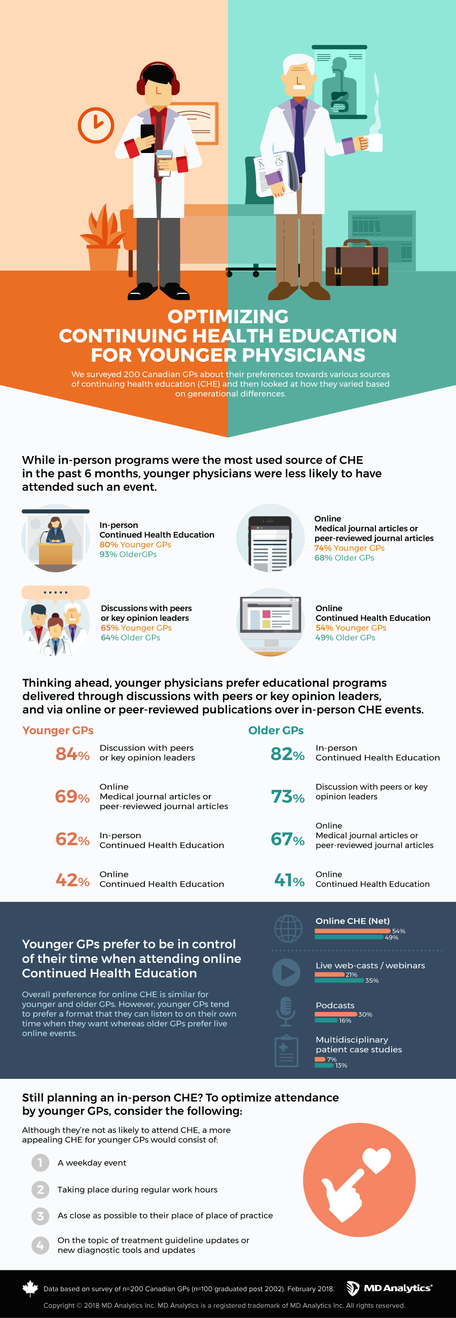 We surveyed 200 Canadian physicians about their preferences towards various sources of continuing health education and then looked at how they varied based on generational differences. While older physicians are more reliant on in-person CHE events for information, younger physicians are almost as equally likely to rely on online medical/peer-reviewed journal articles.