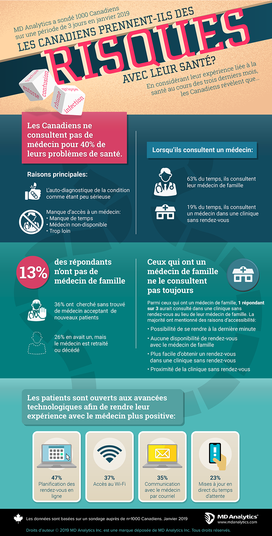 Sur une période de 3 jours, MD Analytics a sondé 1 000 Canadiens responsables de prendre des décisions liées à la santé. L’étude démontre que les répondants choisissent souvent de ne pas consulter un médecin pour un problème de santé quelconque et mentionnent l’auto-diagnostic et le manque d’accessibilité comme raisons principales. Il est également plus probable que les répondants décident de se rendre dans une clinique sans rendez-vous plutôt que chez leur médecin de famille. Leur motivation principale demeure l’accessibilité. Les résultats révèlent également qu’un Canadien sur 8 n’a pas de médecin de famille.